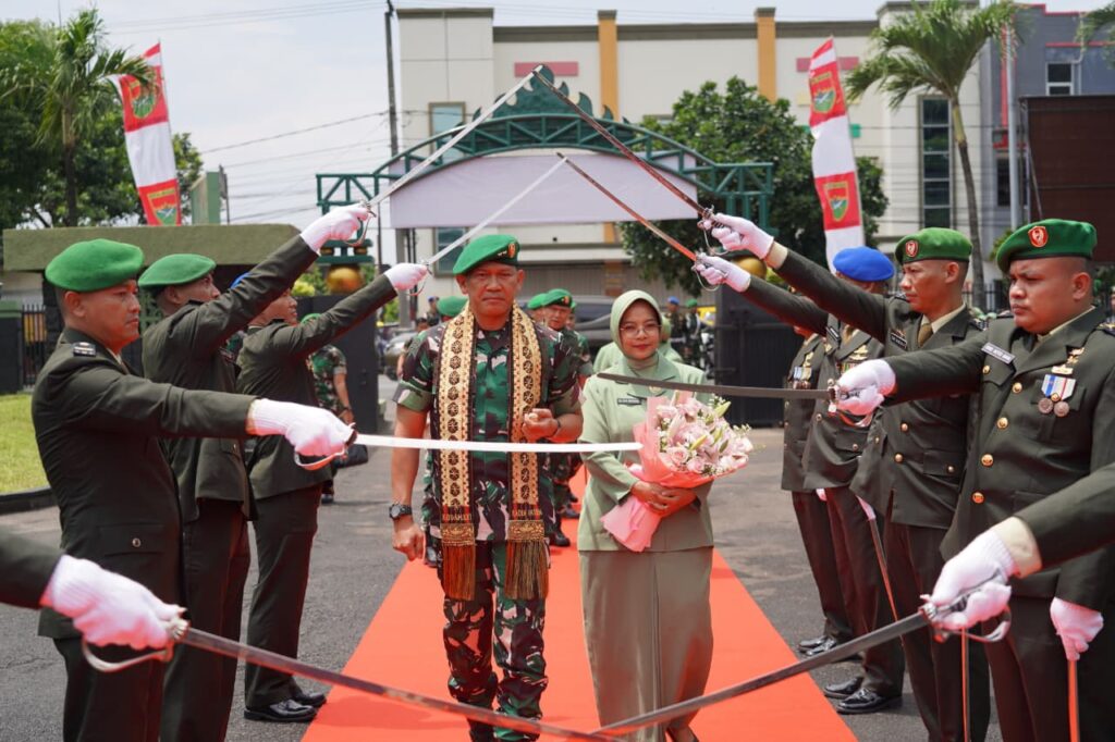 Lampung – Setibanya Pangdam XXI/Raden Inten (RI) Mayjen TNI Kristomei Sianturi, S.Sos., M.Si. (Han) bersama Ketua Persit KCK Daerah XXI/RI Ny. Asti Kristomei Sianturi di Makodam XXI/RI, disambut hangat Danrem 041/Gamas beserta Ibu dan Danrem 043/Gatam beserta Ibu. Penyambutan ditandai dengan pengalungan kain tapis serta pemberian bunga tangan oleh Ibu Danrem 043/Gatam kepada Ibu Pangdam XXI/RI, Sabtu (30/08/2025).