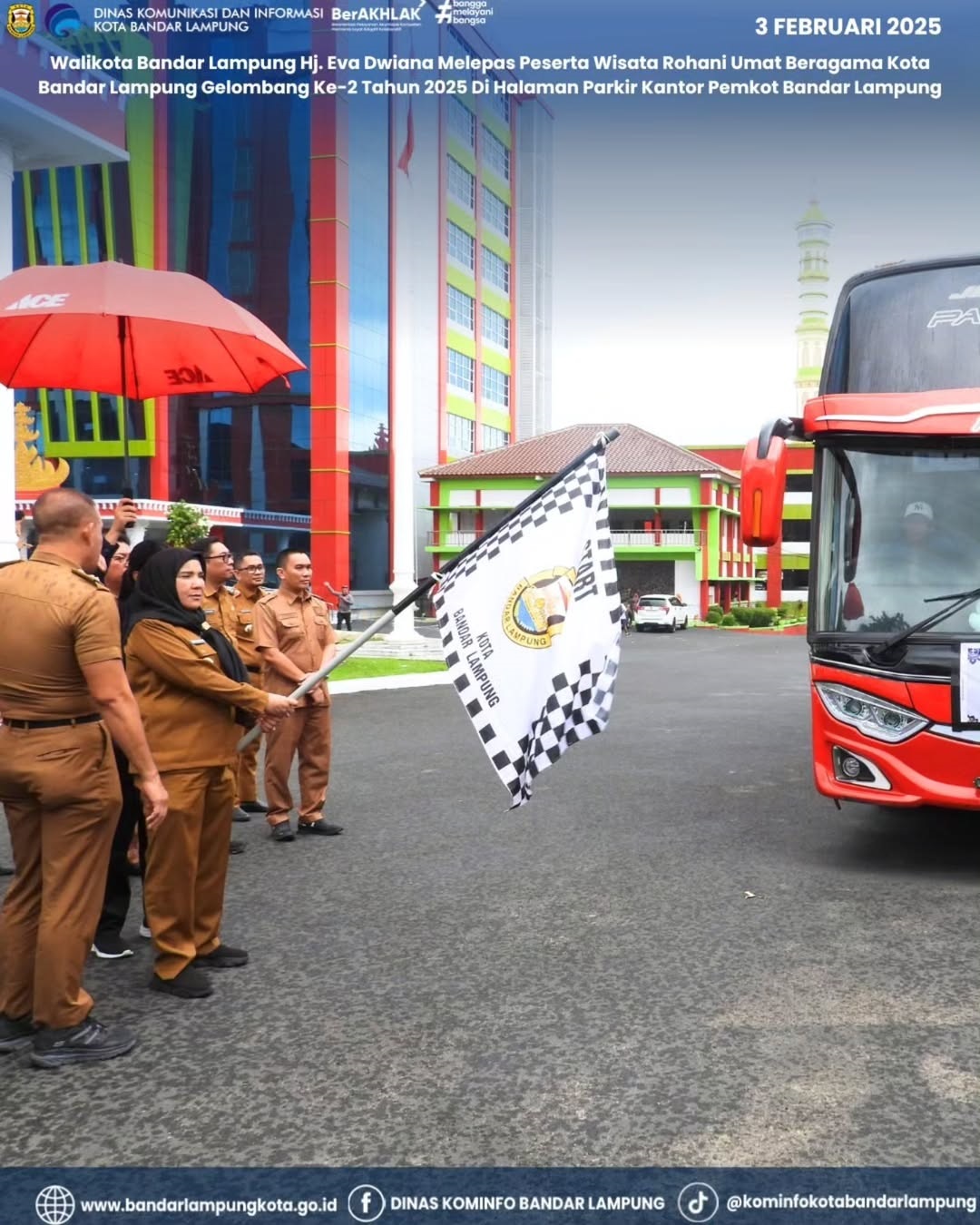 Walikota Bandar Lampung Hj. Eva Dwiana Melepas Peserta Wisata Rohani Umat Beragama Kota Bandar Lampung Gelombang Ke-2 Tahun 2025 Di Halaman Parkir Kantor Pemkot Bandar Lampung