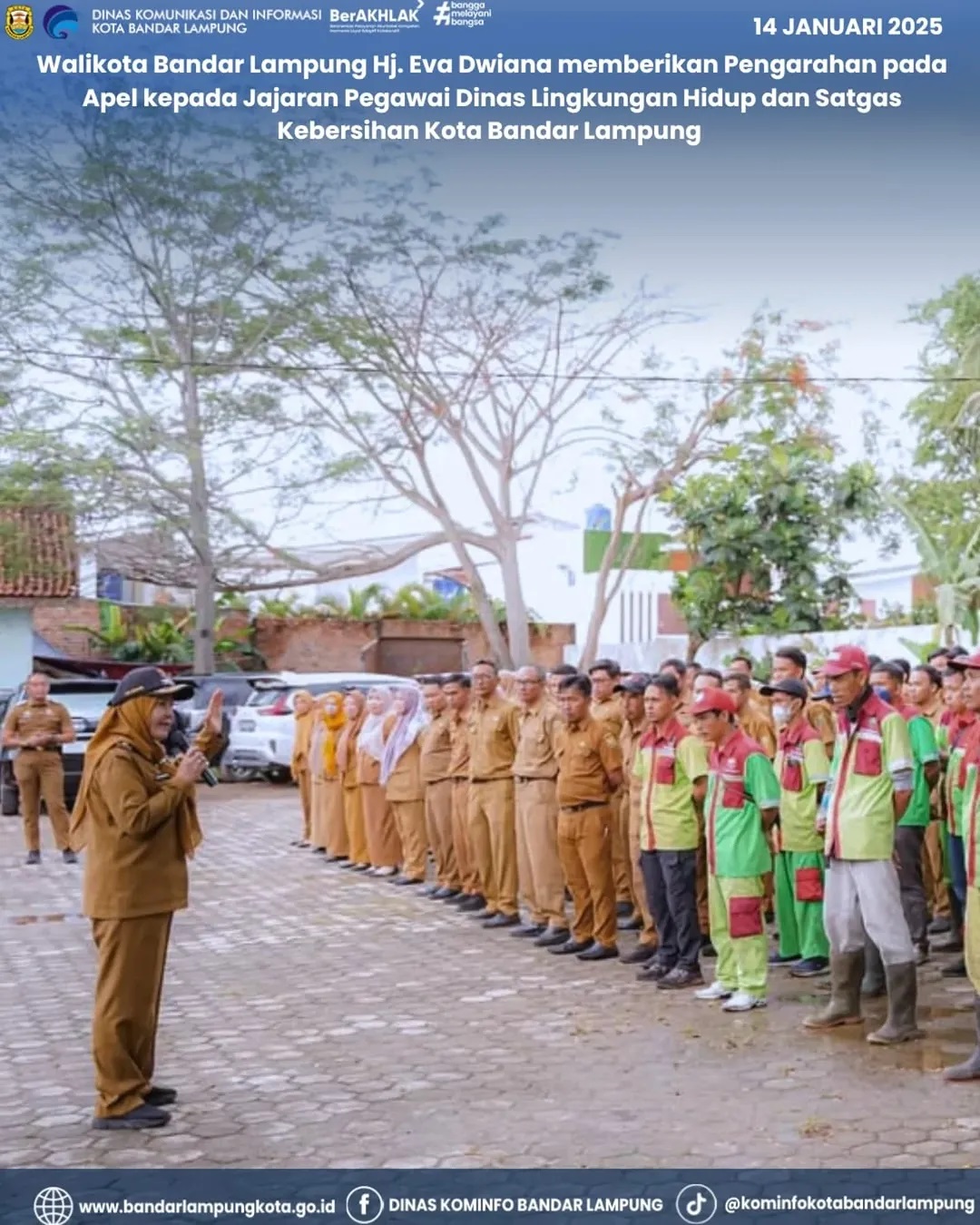 Walikota Bandar Lampung Hj. Eva Dwiana memberikan Pengarahan pada Apel kepada Jajaran Pegawai Dinas Lingkungan Hidup dan Satgas Kebersihan Kota Bandar Lampung Di Halaman Kantor Dinas Lingkungan Hidup Kota Bandar Lampung. Selasa (14/01/2025).