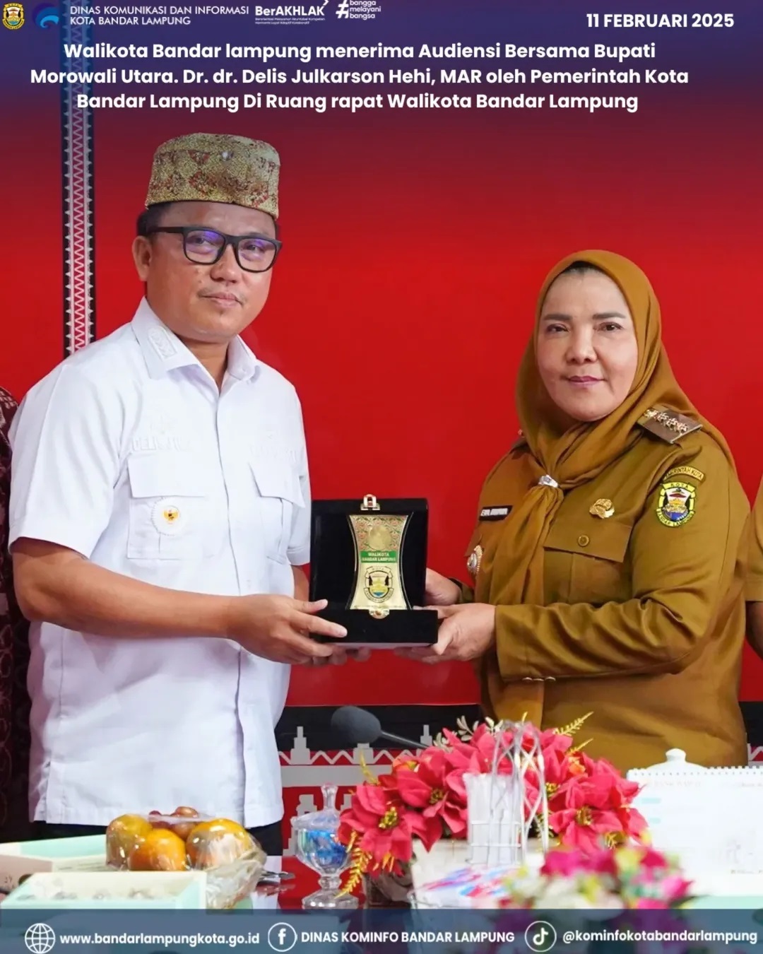 Walikota Bandar lampung menerima Audiensi Bersama Bupati Morowali Utara. Dr. dr. Delis Julkarson Hehi, MAR oleh Pemerintah Kota Bandar Lampung Di Ruang rapat Walikota Bandar lampung. Selasa (11/02/2025).